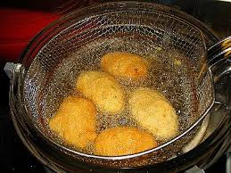 2- علامة حرارة الزيت بأن تضعي قطعة خبز صغيرة في الزيت فإذا احمرت في خلال دقيقة فتكون هذه حرارة الزيت المطلوبة .